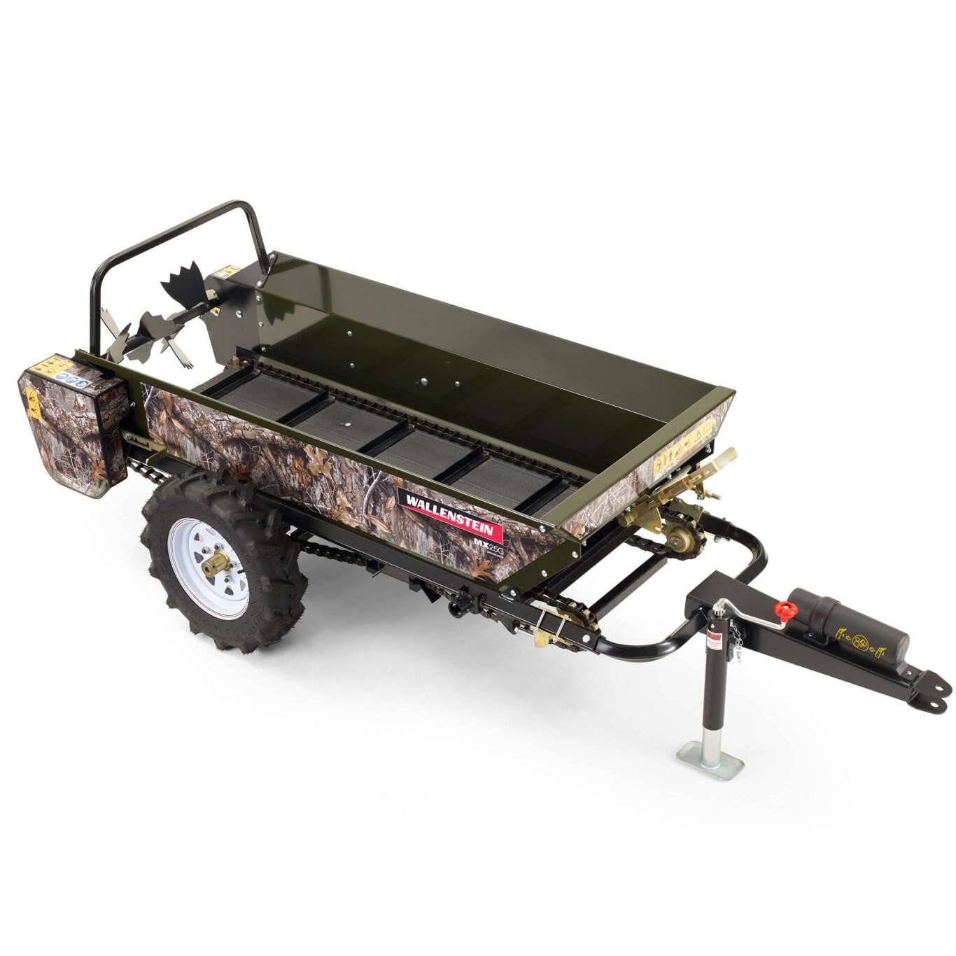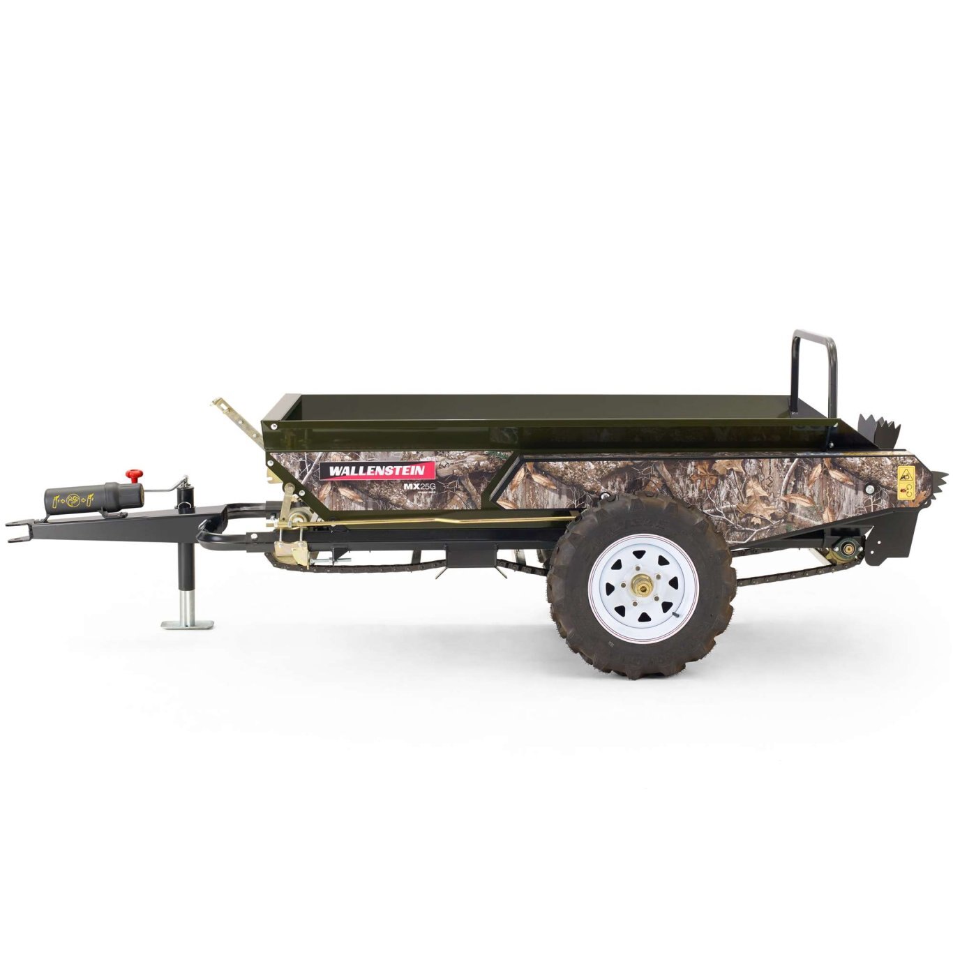 25 bushel capacity, the MX25G ground driven manure spreader offers simplicity and reliability with ATV's, UTV's or even lawn tractors. Traction implement tires are standard to ensure the torque is there for a fine, consistent spread.